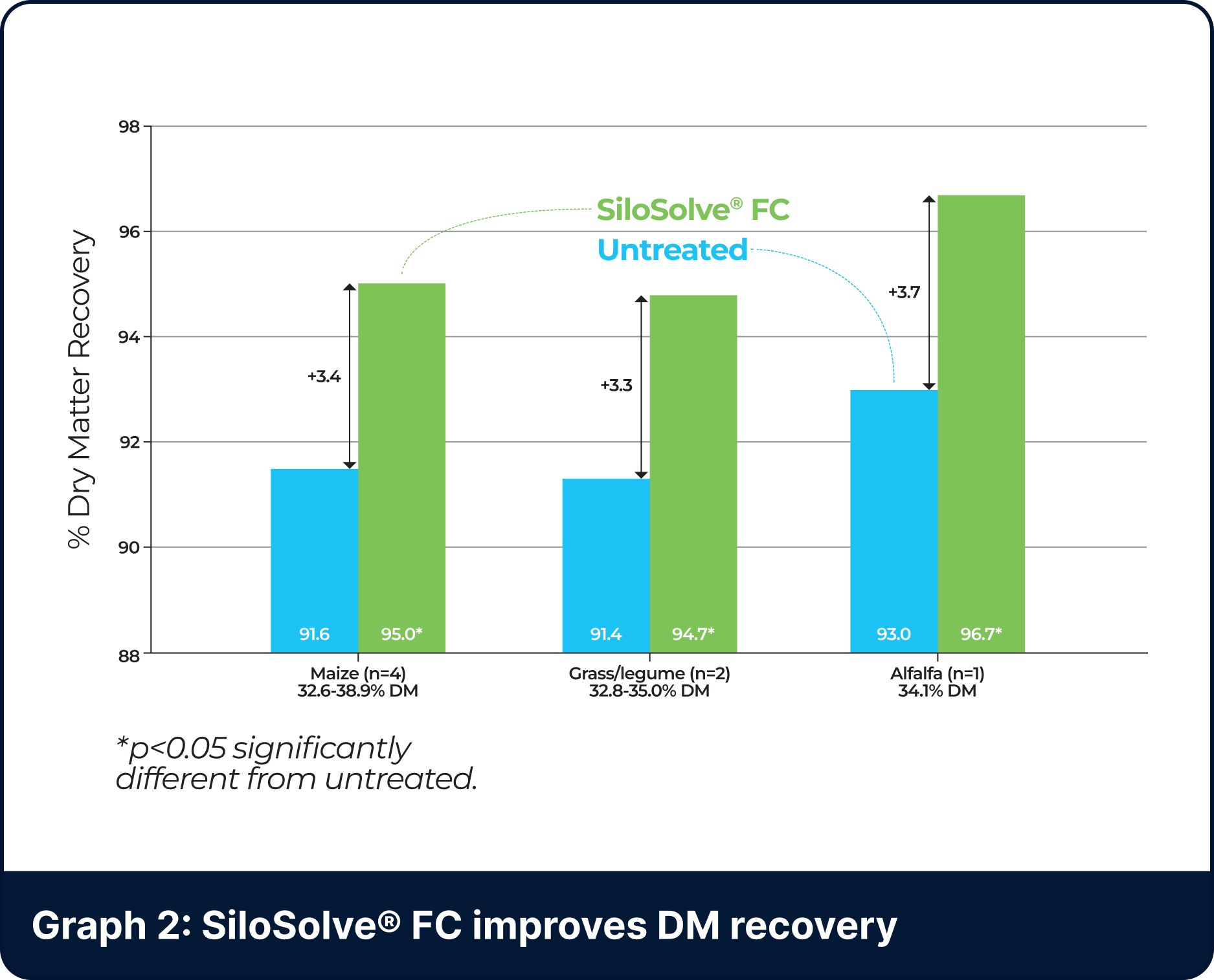 SiloSolve® FC is a unique, dual-action inoculant that improves aerobic stability and at the same time improves dry matter recovery over a broad range of dry matter and forages. While SiloSolve® FC increased aerobic stability up to 30 days in university trials, dry matter recovery across crops was improved an average of 3.5% points compared to untreated silages. (See Graph 2).